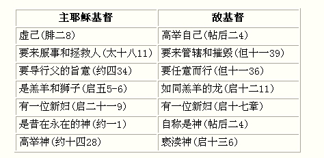 1.当圣经称之为「敌基督」的那位大有能力,又极为邪恶的人物出现,这个世界便开始进入大灾难时期。这个人物似乎会成为世上前所未有的伟大战士、国家元首和宗教领袖(结二十八3-7)。以下的经文均有提及他:但以理书七2-27,九25-27,十一35至十二3;帖撒罗尼迦后书二1-12;约翰壹书二18、22,四3;约翰贰书7;启示录十三11-18和十九20。这位可怕的人物如今可能已生在世上。圣经亦称他为「大罪人」(帖后二3)、「沉沦之子」(帖后二3)、「不法的人」(帖后二8),先知但以理则称他为「卑鄙的人」(但十一21)。他将会是撒但的爪牙,是魔鬼扮成的假基督。请留意以下七项明显的对比: